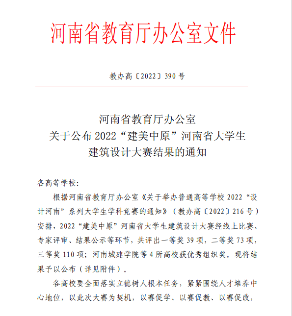 2022年11月16日河南省教育厅公布了2022年“建美中原”河南省大学生建筑设计大赛的结果,6163银河线路检测中心的参赛队伍在比赛中荣获二等奖2项、三等奖4项。